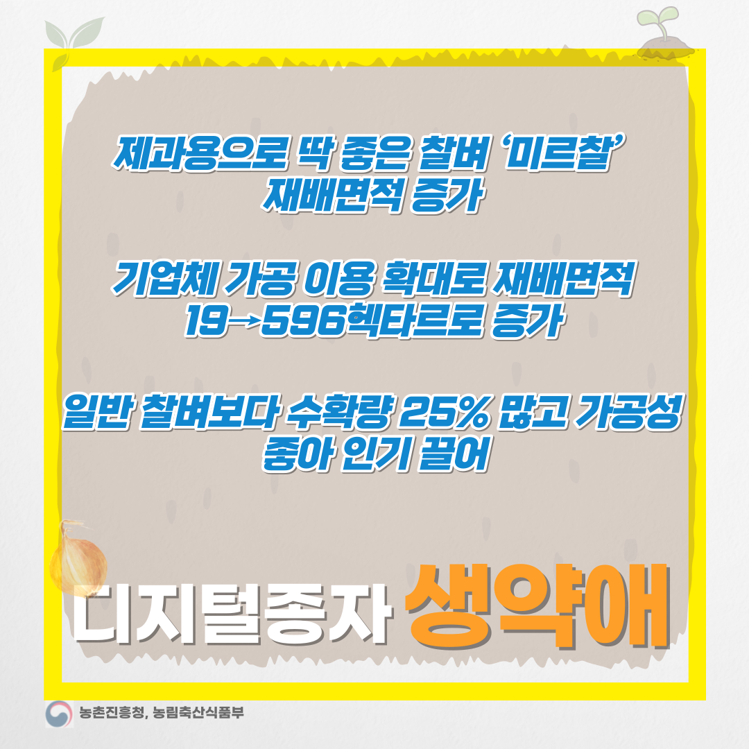 이러한 미르찰의 장점이 알려지면서 전북 익산과 전남 해남지역을 중심으로 기업체와의 계약재배가 증가하고 있습니다. 이에 따라 '미르찰'의 재배면적은 2020년 19헥타르에서 2021년 271헥타르, 2022년 596헥타르로 크게 증가하였습니다.