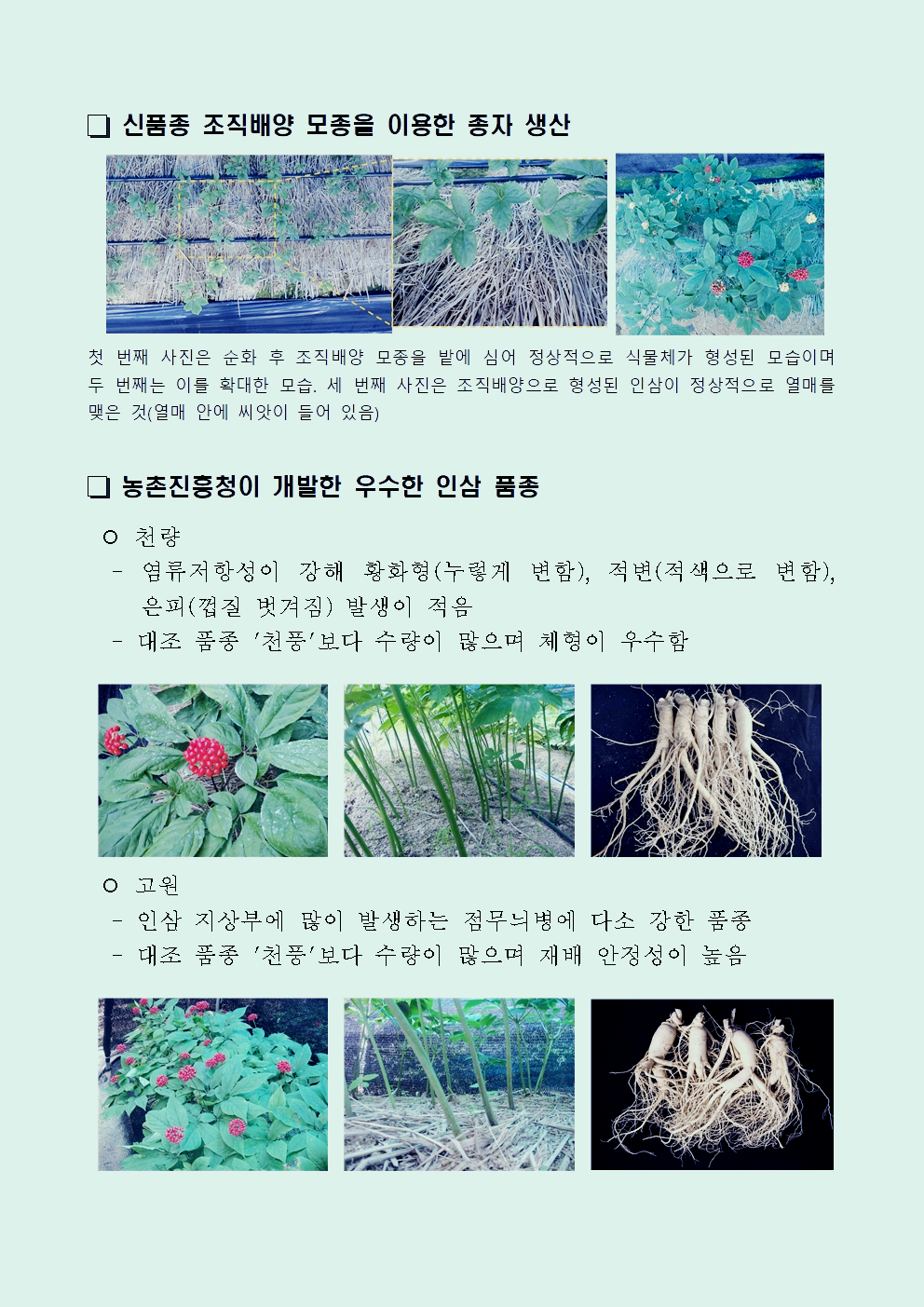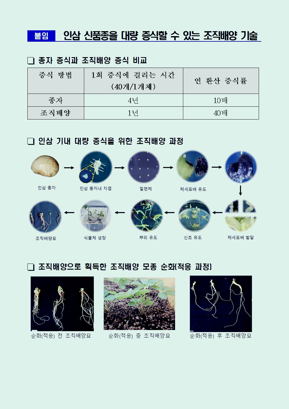 농촌진흥청 국립원예특작과학원 인삼과 마경호 과장은 “앞으로 조직배양 기술을 활용해 우수한 품종을 빠르게 보급함으로써 인삼을 안정적으로 생산하고, 나아가 경쟁력 향상으로 고려 인삼의 명성을 잇는 데 힘을 쏟겠다.”라고 전했습니다.