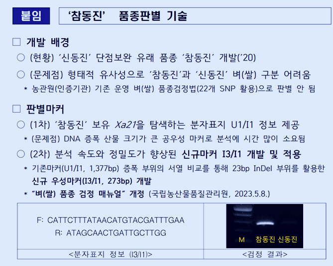'참동진'과 '신동진', '강대찬' 등 중대립 품종들을 빠르고 정확하게 구별할 수 있는 디엔에이(DNA) 분자표지를 개발하여,