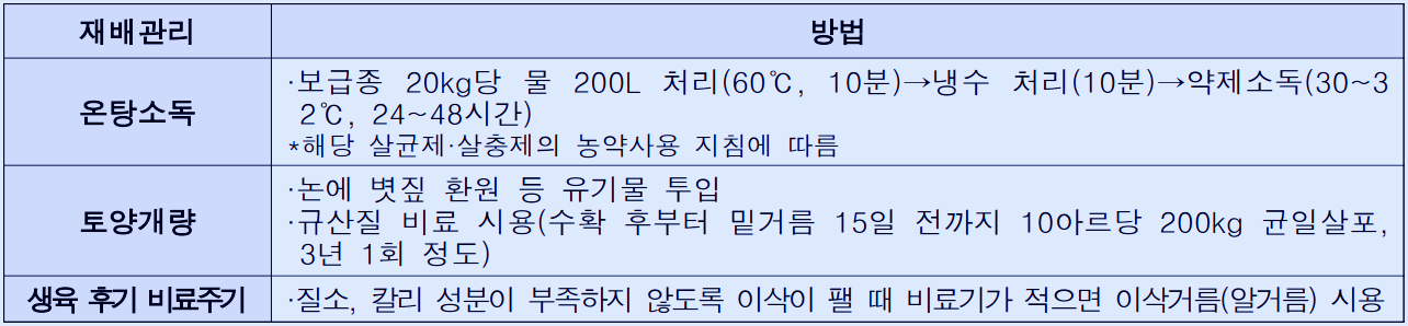 토양 개량하고 생육 후기에 양분이 부족하지 않도록 비료를 잘 줘 병을 예방 수 있으며, 파종 전 종자소독도 철저히 해야 합니다.