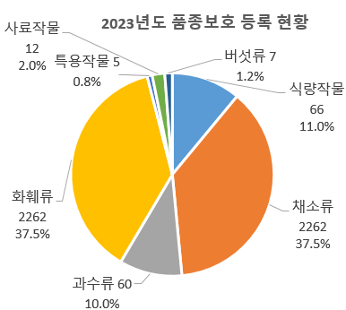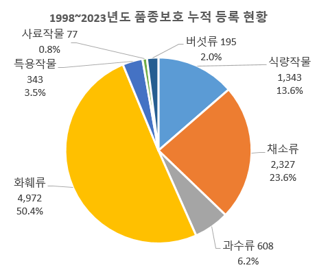 또한 2023년까지 품종보호 등록된 9,865개 품종은 화훼류가 4,972품종(50%), 채소류는 2,327품종(24%), 식량작물은 1,343품종(14%), 과수류는 608품종(6%) 순서로 나타났습니다.