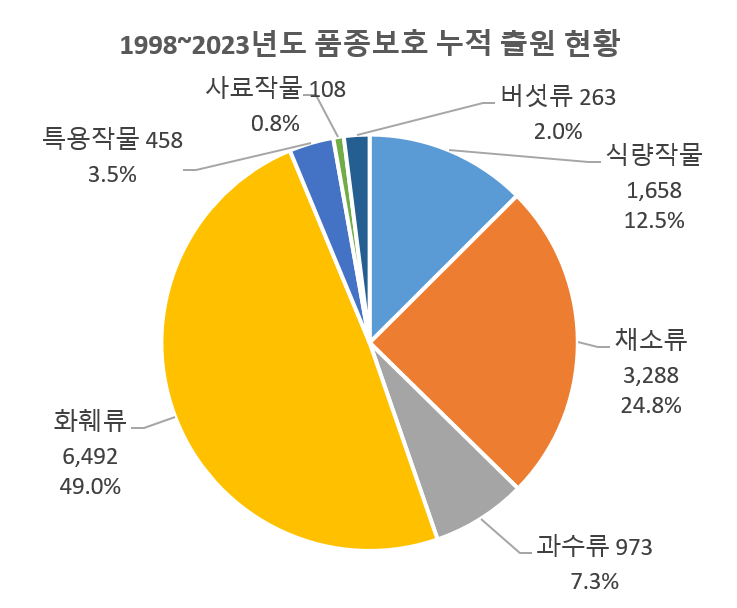 1998년 품종보호제도 시행 이후 2023년까지의 누적 출원 현황은 장미, 국화 등 화훼류가 6,492품종(49%)으로 가장 많았습니다.
